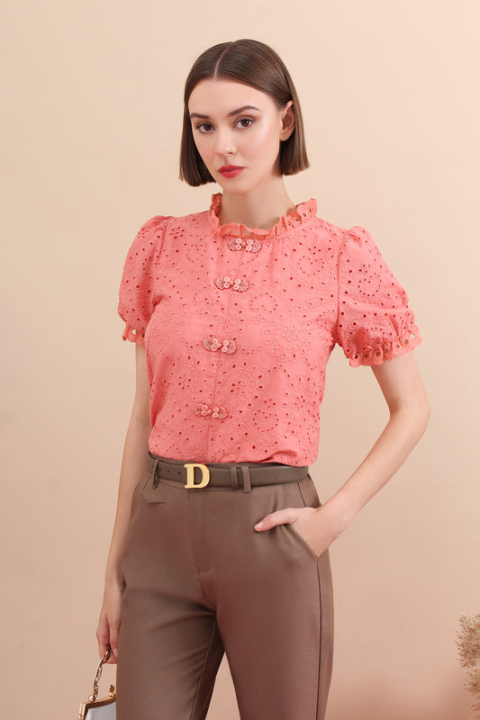 Eyelet Mandarin Collar Puff Sleeve Top