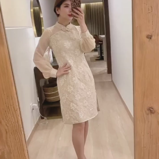 A modern cheongsam designed for festive elegance. The Qipao Luna Lace Textured Jacquard Sheer Sleeves features a delicate floral lace overlay paired with soft, sheer chiffon sleeves for a graceful, feminine finish. Crafted with a classic mandarin collar and a clean, fitted silhouette, it flatters comfortably while offering a refined nod to tradition.