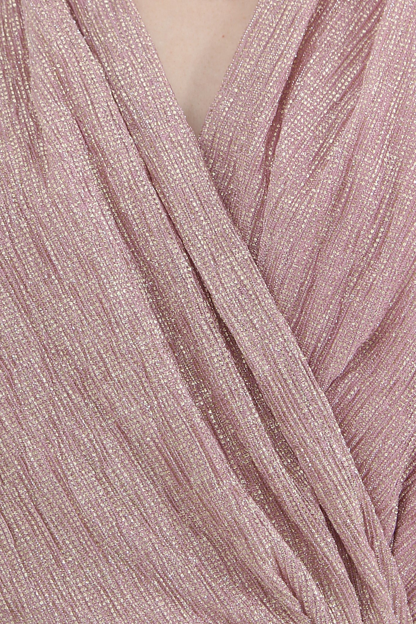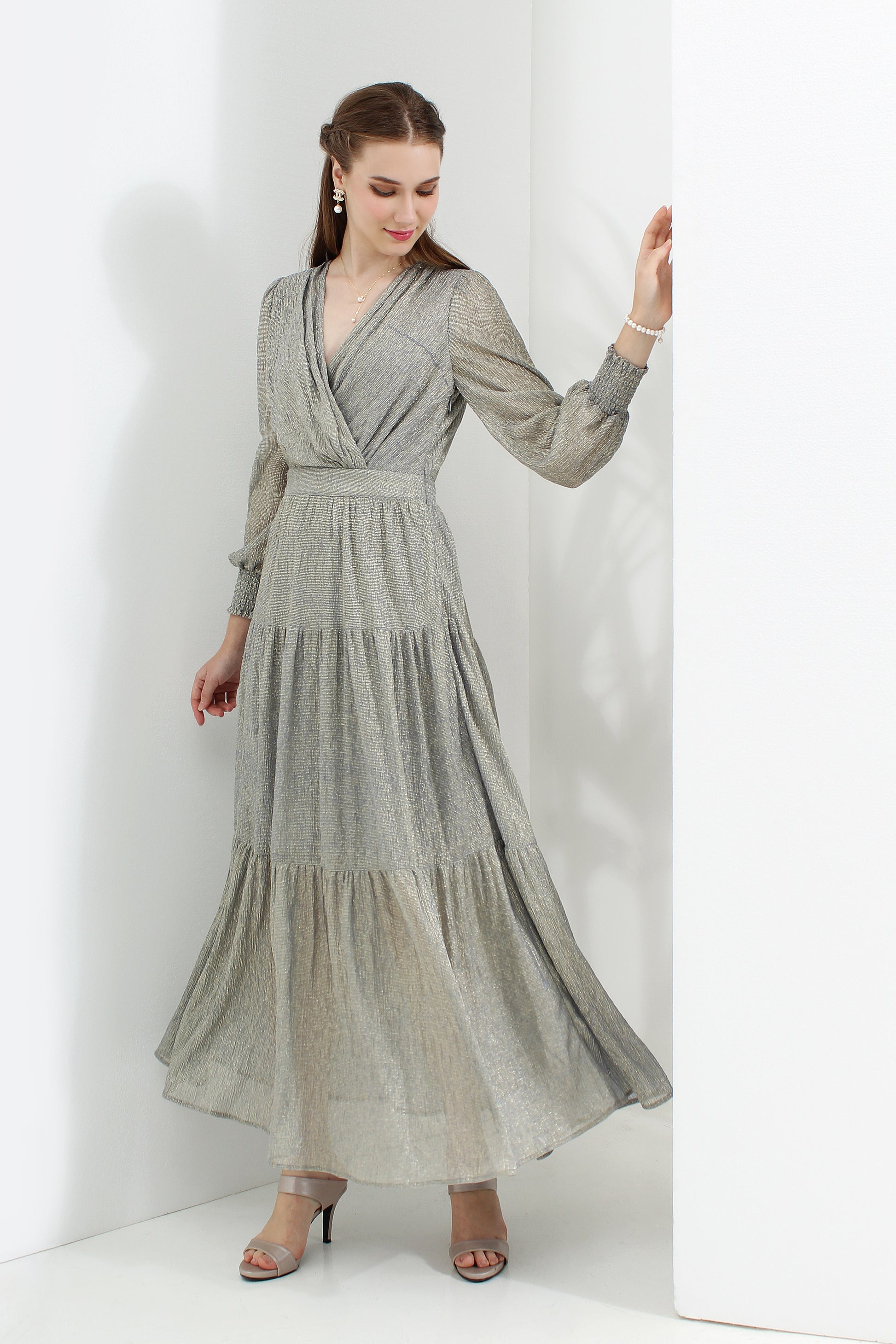 This elegant dress features a shimmering fabric with a delicate metallic sheen, giving it a sophisticated and festive appeal. The design includes a surplice wrap-style bodice with a V-neckline, long sheer sleeves gathered at the cuffs, and a cinched waist that creates a flattering silhouette. The skirt is full-length and flows gracefully with tiered layers, adding soft volume and movement. Ideal for formal occasions, evening events, or celebrations, this dress combines timeless glamour with modern elegance.