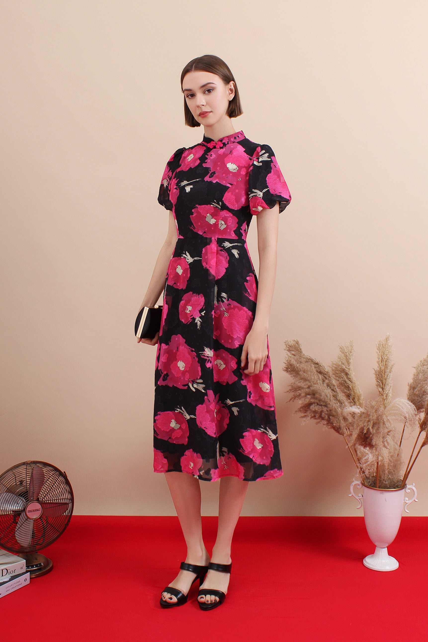 A modern qipao designed to flatter and inspire confidence. The Jade Bloom Modern Qipao Midi Dress features a refined mandarin collar paired with a statement floral print, updated with a soft, flared silhouette for effortless wear.