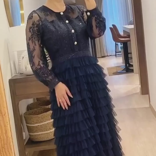 A statement piece designed to captivate. The Mira Lace Tiered Midaxi Dress features a delicately embroidered lace bodice with sheer sleeves and pearl-accented buttons for a touch of classic elegance. The waist falls into a full tiered tulle skirt, creating beautiful movement and texture with every step.
