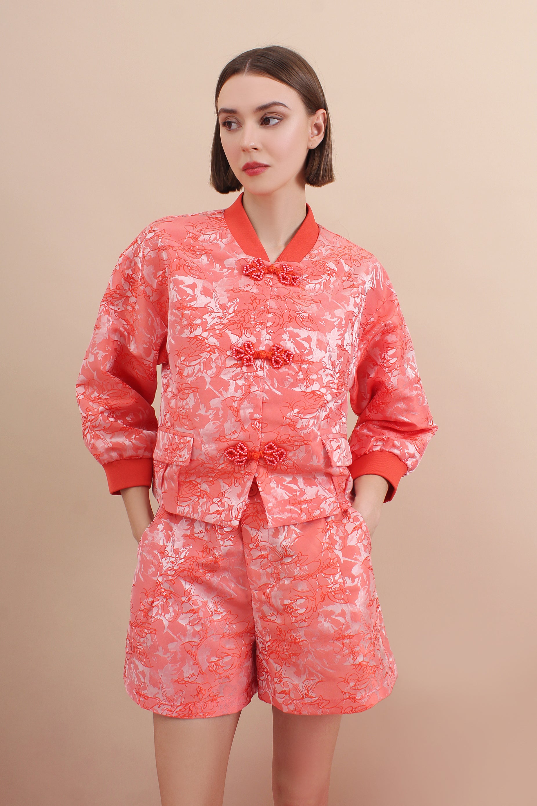 A modern Oriental jacket set crafted from soft jacquard fabric, designed with a gentle structure that looks elegant without feeling rigid. The subtle floral motifs woven into the fabric give the entire look a refined texture, catching light in a beautifully understated way.