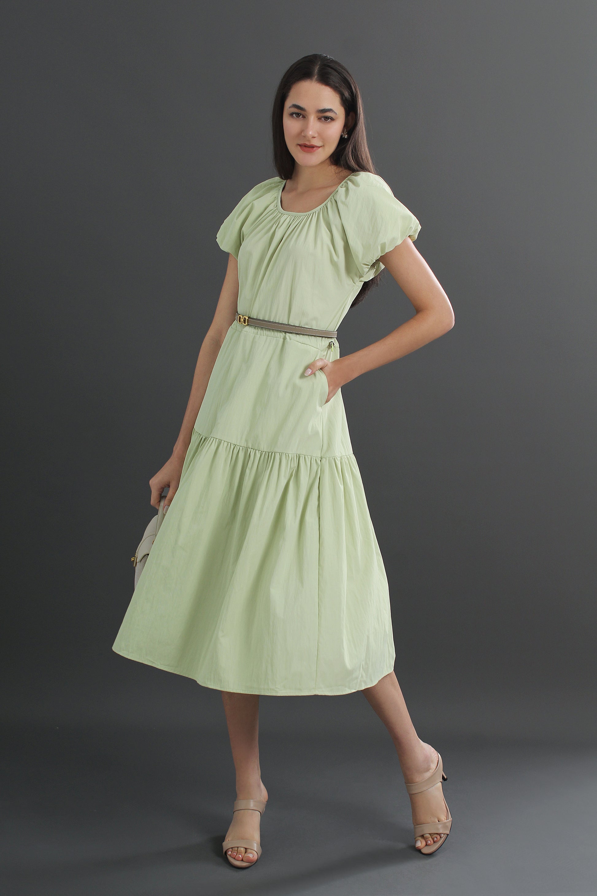 Cotton Puff Sleeve Round Neck Midi Dress