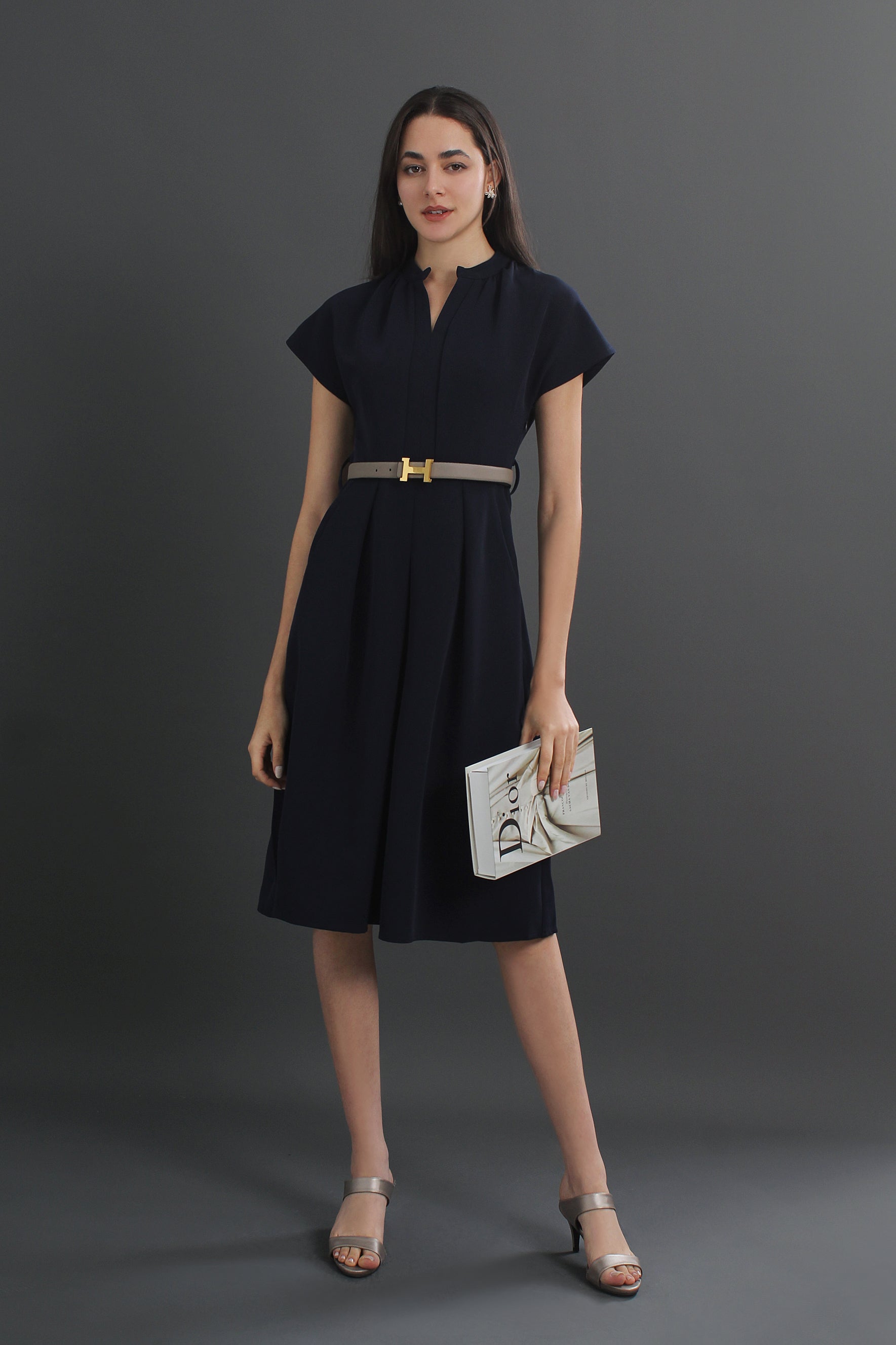 The Charlotte V-neck Belted Midi Dress is a sophisticated wardrobe essential designed to elevate your everyday style. Featuring a soft V-neckline with subtle pleating, chic cap sleeves, and a flattering midi-length silhouette, this dress combines elegance with ease. The matching fabric belt cinches the waist for a tailored look, while structured box pleats add graceful movement.