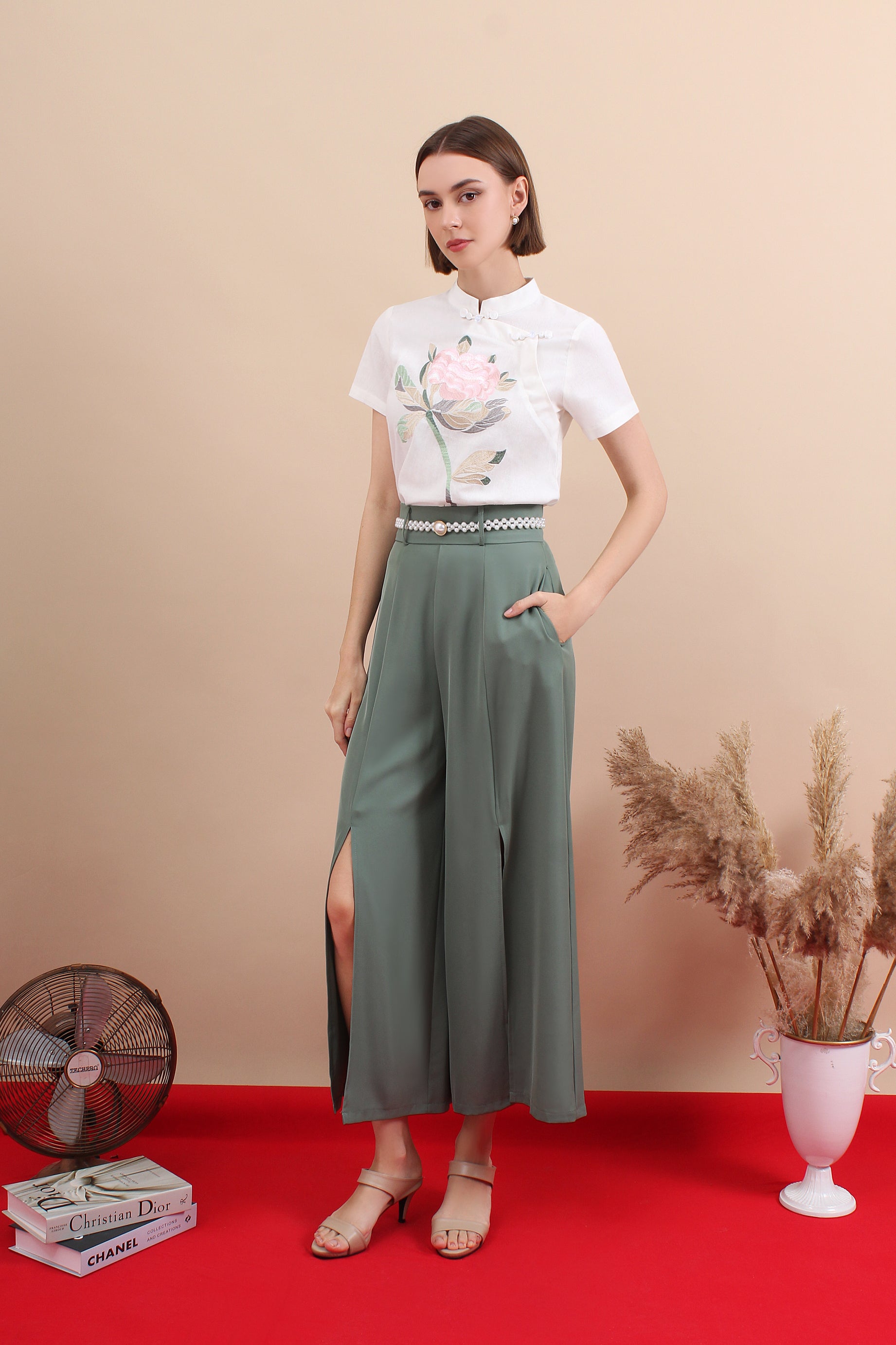 This top features a classic mandarin collar with delicate floral embroidery placed gently across the front. The embroidery flows diagonally, creating a soft visual line that looks neat and flattering when worn.