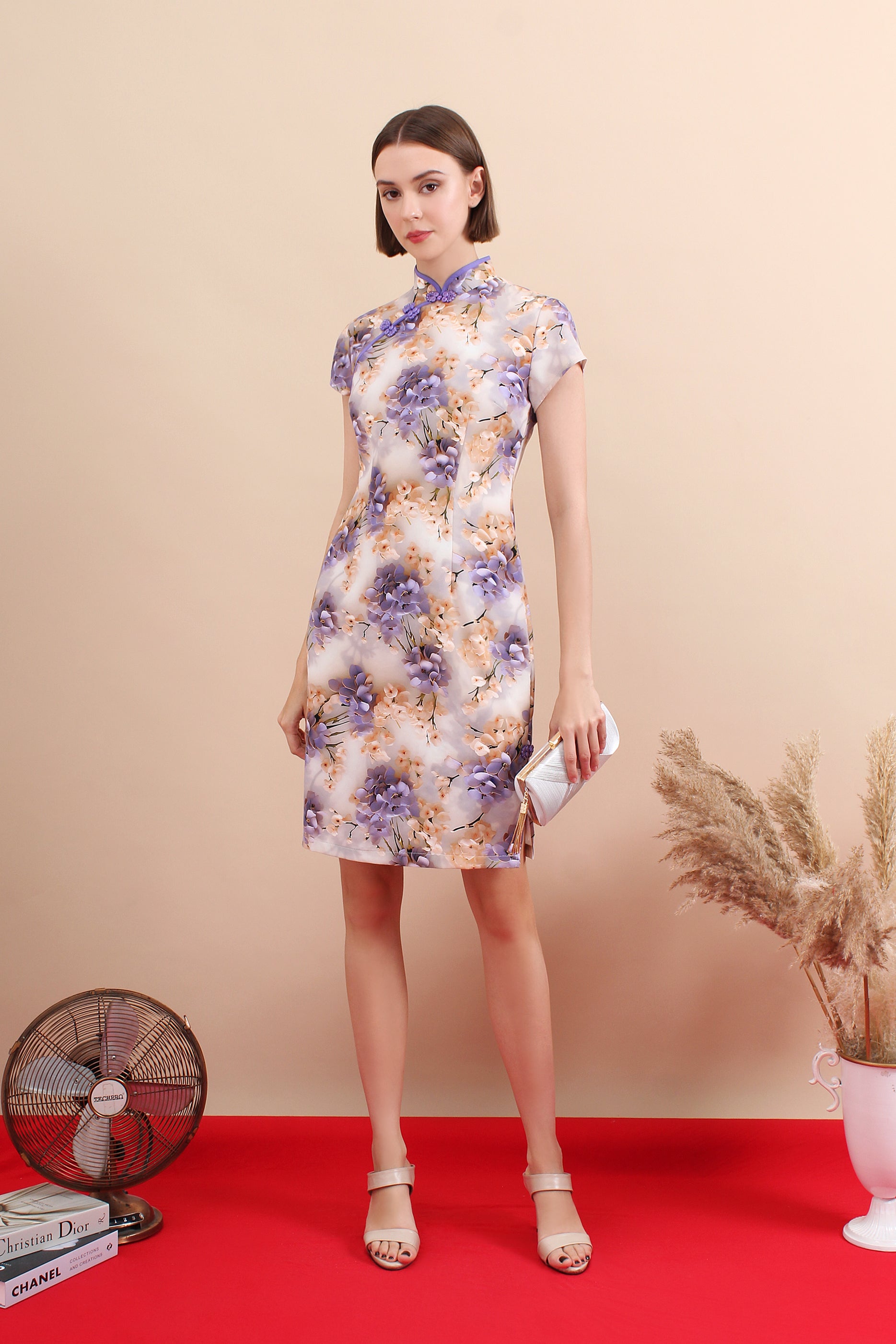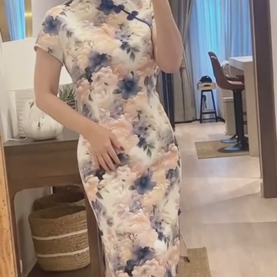 A timeless qipao dress brought to life with a rich, all-over floral print that feels vibrant yet refined. The sculpted Mandarin collar frames the neckline neatly, adding structure and elegance without feeling stiff or restrictive.