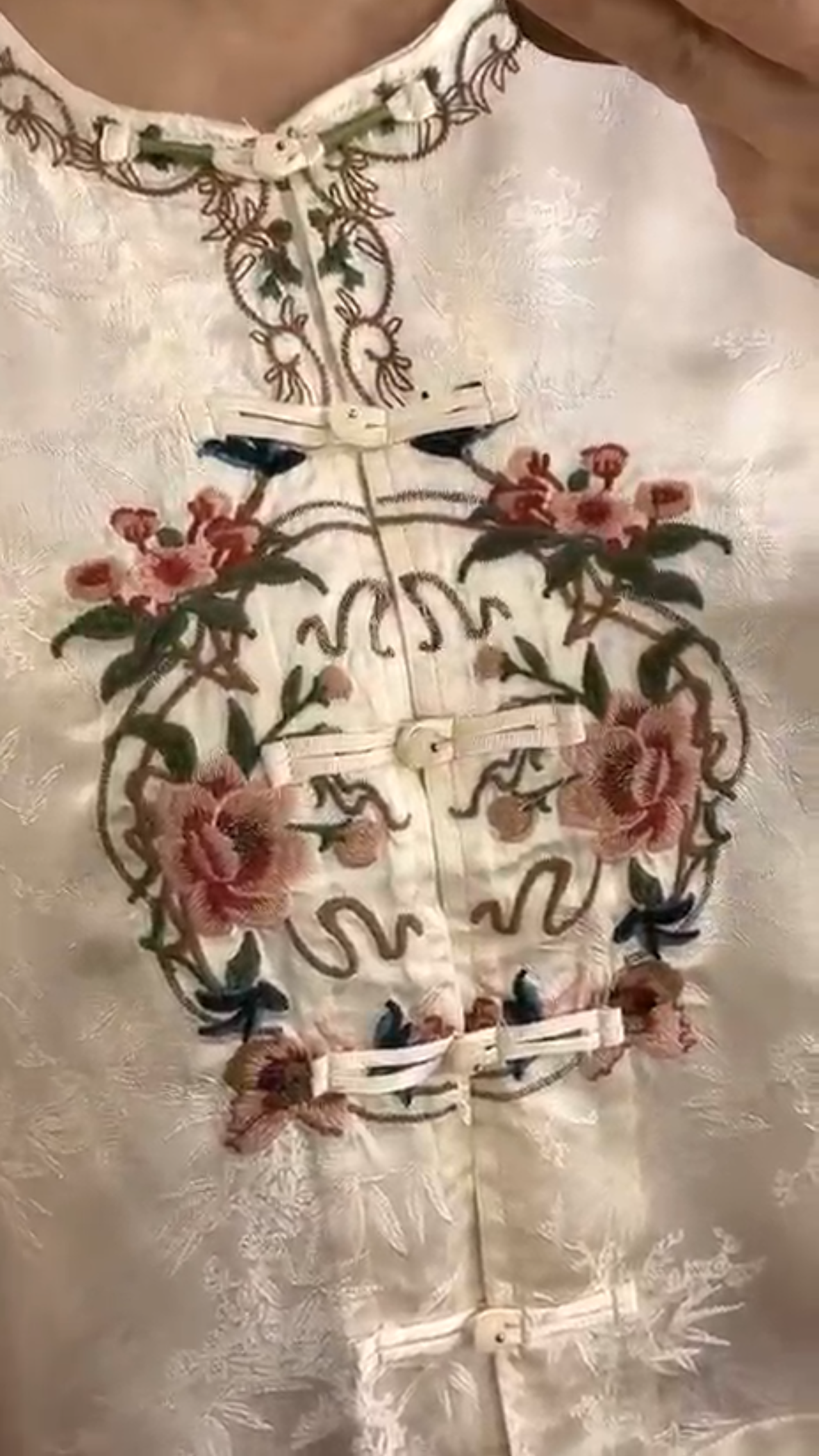 Highlighted with contrasted embroidery around the collar and sleeves and knot buttoned design.